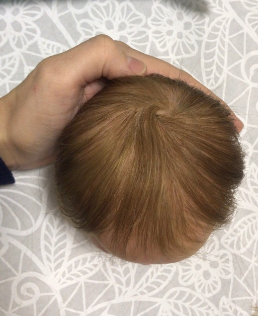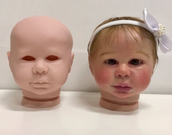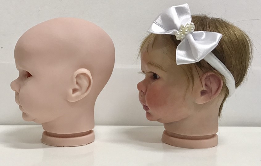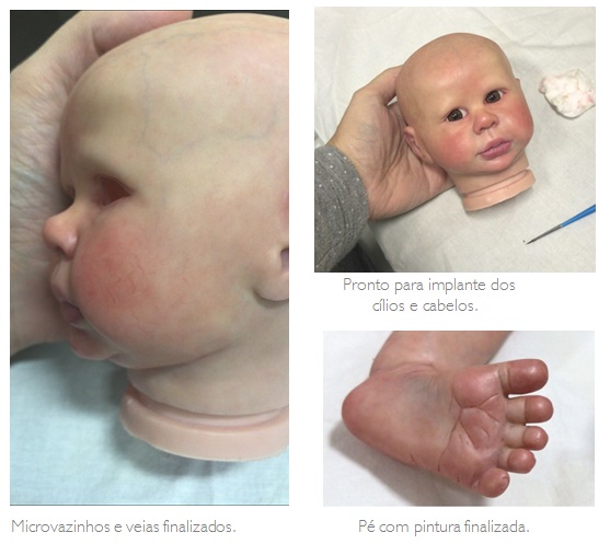 Na primeira etapa, sobre os chamados “kits reborn”, que normalmente são compostos por cabeça e membros em vinil, aplico um minucioso processo de pintura artesanal. São inúmeras camadas de pintura com tons de pele translúcida, manchinhas e texturas, detalhes são acrescentados como veias, micro vasos sanguíneos, efeito de unhas crescidas, dobrinhas, efeito de luz e sombra, sobrancelhas delicadamente pintadas fio a fio que a cada etapa precisa ir ao forno (usado somente para arte) para selar a pintura.